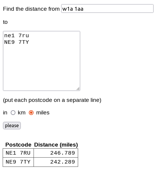 Find the distance between a 'home' postcode and a list of other postcodes.