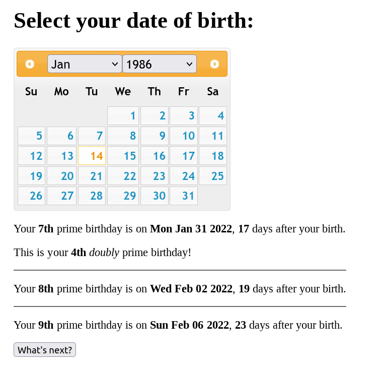This is a simple script which asks for your date of birth and then calculates when your next prime birthday is.
